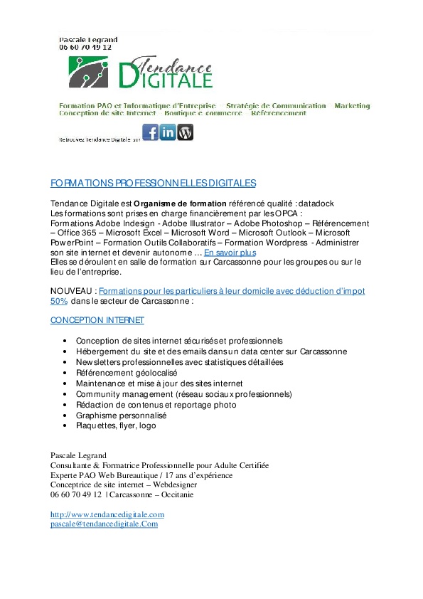 Pascale Legrand Formatrice pour adultes depuis 2002, certifiée, dans les domaines du Digitale vous propose :
