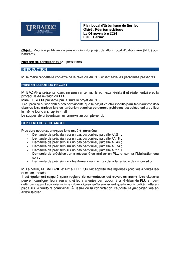 A la suite de la Réunion Publique du 04/11/2024 voici ci-dessous le Compte-Rendu de la Réunion Publique.