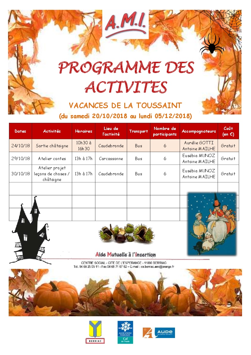 Programme des activités des vacances scolaires de la Toussaint avec les enfants/parents suivis par notre Centre Social A.M.I. de Berriac.